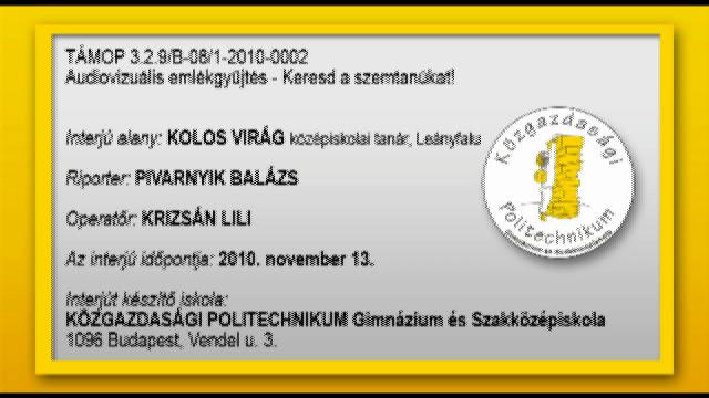 A katolikus pap interjúalany 1924-ben született Budapesten. Szegénységben telt el gyermekkora, mégis boldog volt. 1930-ban kezdte el az elemi iskolát Kispesten. Sok Erdélyből menekült diáktársa, tanára volt. Beszél az iskolai oktatás körülményeiről. (03:50) Elmondja, hogyan látta Budapest ipari fejlődését a Horthy-korszakban, nagyon sok volt a külföldi befektető, gyáros, szakmunkás. (06:42) Elmondja családjának történetét, nagyszülei hogyan kerültek Magyarországra Alsó-Ausztriából. A környékbeli lakosok többsége is német anyanyelvű volt. (12:18) 1974-ben járt először Nyugaton (Franciaországban), ott látott ahhoz hasonló emberséges társadalmi viszonyokat, mint a 20-as, 30-as évek Magyarországán. (15:16) Beszél a Horthy-korszakbeli és a mai életkörülmények közötti különbségekről. (19:32) Elemi iskola után tovább lehetett lépni polgári iskolába, tanítóképzőbe vagy képesítőbe. Az akkori rendszert jónak tartja, bár a lányoknak nehezebb volt továbbtanulnia. A mai koedukált iskolákat rossznak tartja, mivel szerinte a két nem között így elvesznek a különbségek. (22:36) Elmondja, hogy gyermekkorának közbiztonsága sokkal jobb volt a mainál. Nehezebbek voltak az életkörülmények, de biztonságos volt az élet. 1937-ig komolyan meg kellett húzni a nadrágszíjat, de boldogak voltak az emberek, lelkükben voltak gazdagok. (28:58)